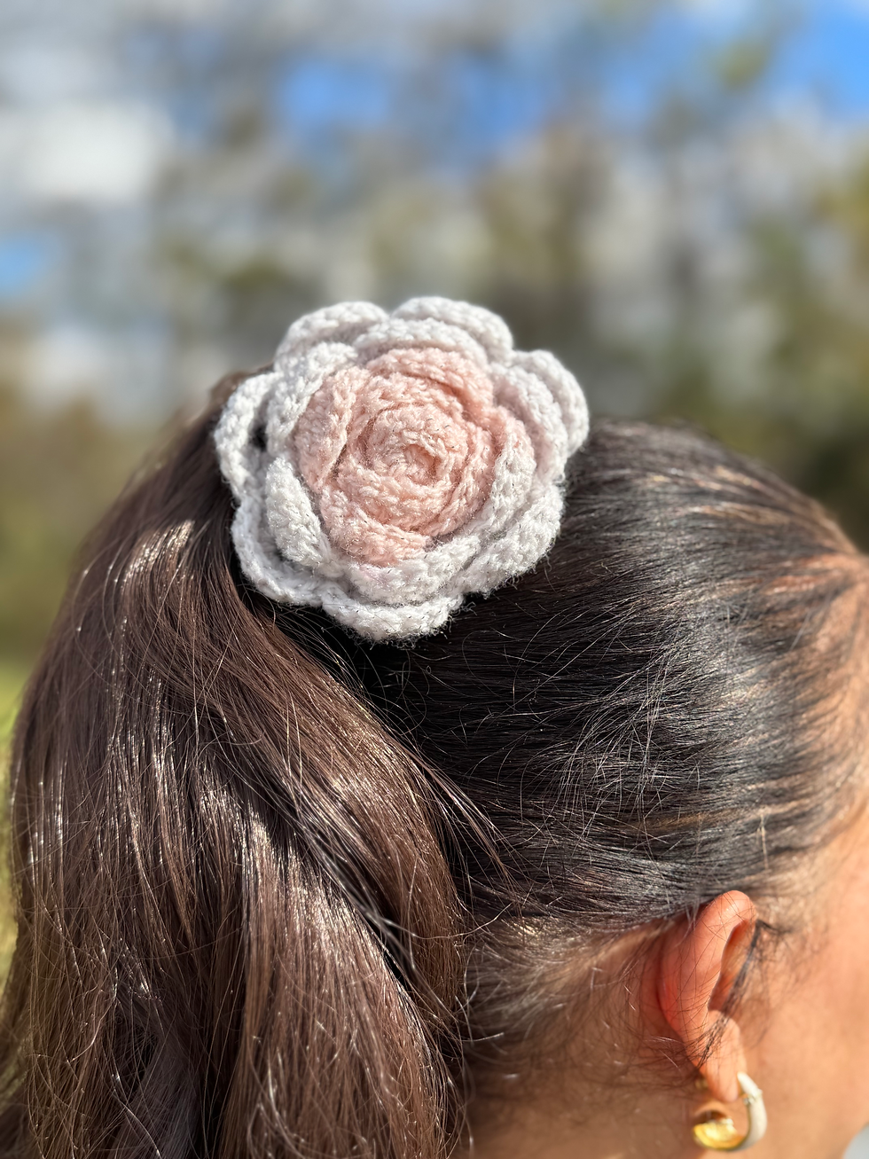 This variegated crochet rose clip blends pink, purple, peach, and dusty blue like a swirl of cotton candy. 4 inches wide, 2-inch clip, handmade from acrylic yarn for a playful, enchanting accessory.